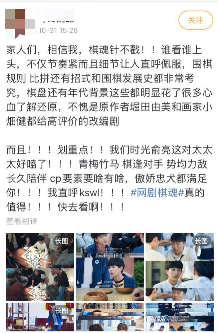 “家人们,相信我,《棋魂》针不戳!谁看谁上头,不仅节奏紧而且细节让人直呼佩服,围棋规则比拼还有招式和围棋发展史都非常考究,棋盘、年代背景都明显花了很多心血了解还原,不愧是原作者堀田由美和画家小畑健都给高评价的改编剧。”