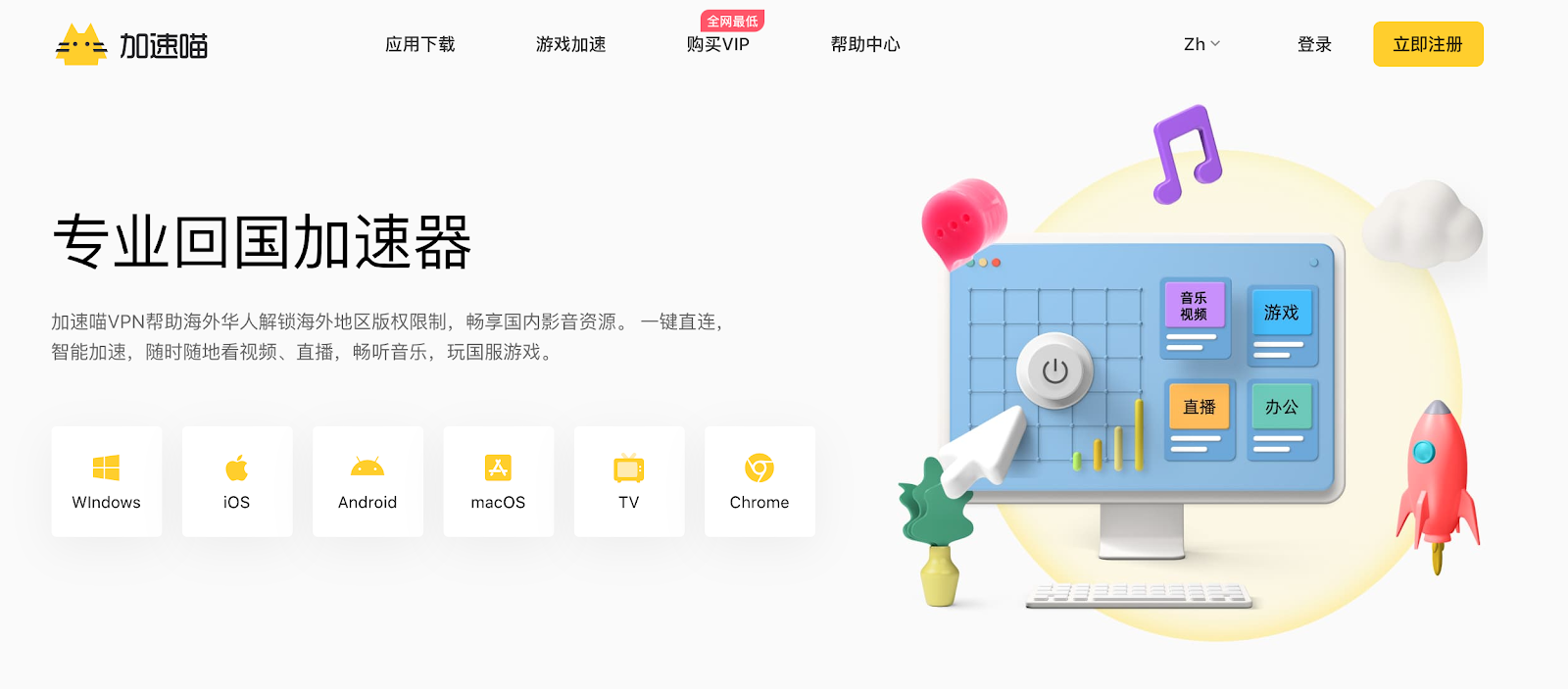 专为海外华人及港澳台地区用户使用,解锁中国大陆地区版权限制,加速国服游戏。支持音乐、视频、直播(b站和虎牙)、办公或炒股等场景。