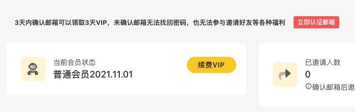 登陆官网个人中心 ,在个人中心内去认证邮箱,即可获得3天会员。