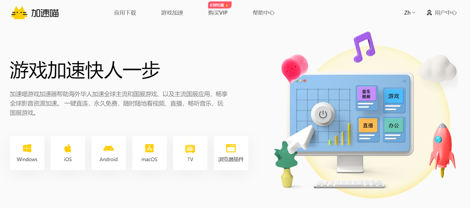 加速喵支持iOS、Android、macOS、Windows、TV多平台安装使用,一个会员账号支持个人三台设备同时运行,满足多需求场景,音视频、游戏、直播随意切换,独创增强模式,玩国服游戏也可以直播、听音乐。