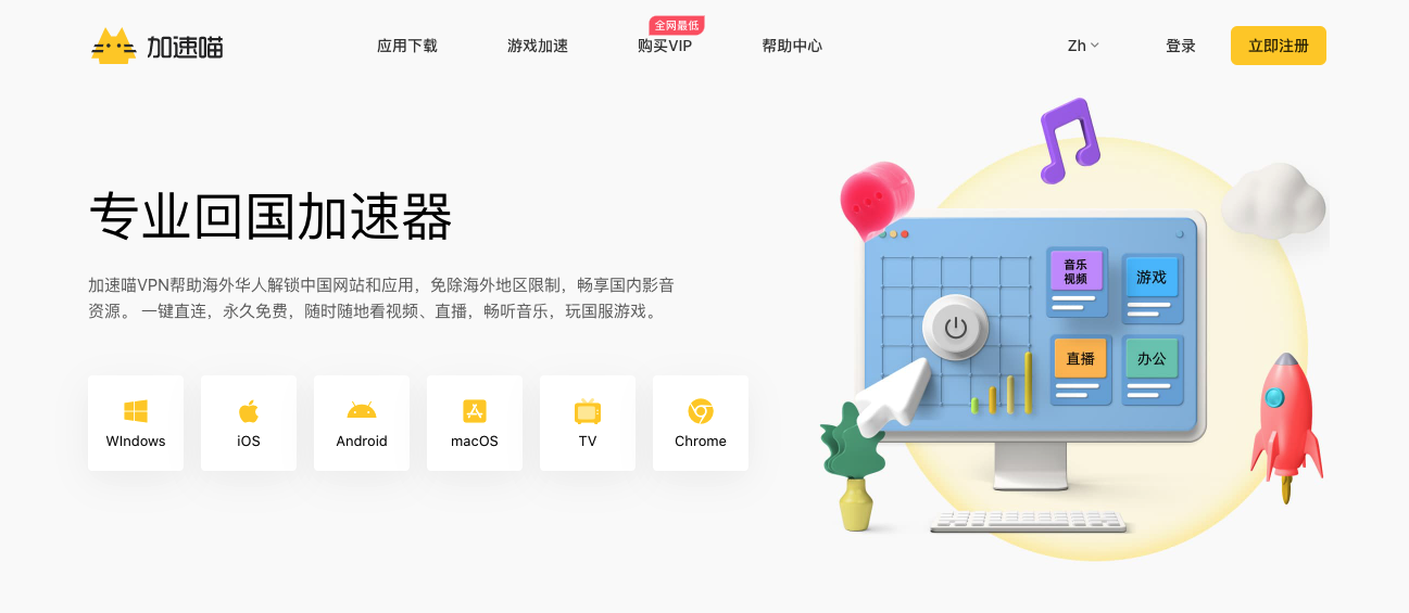 放轻松,有加速喵回国VPN助你一臂之力。海外华人留学生/港澳台地区用户翻墙回国VPN:【加速喵】,一键解锁海外地区限制问题,永久免费也可付费使用的回国利器。