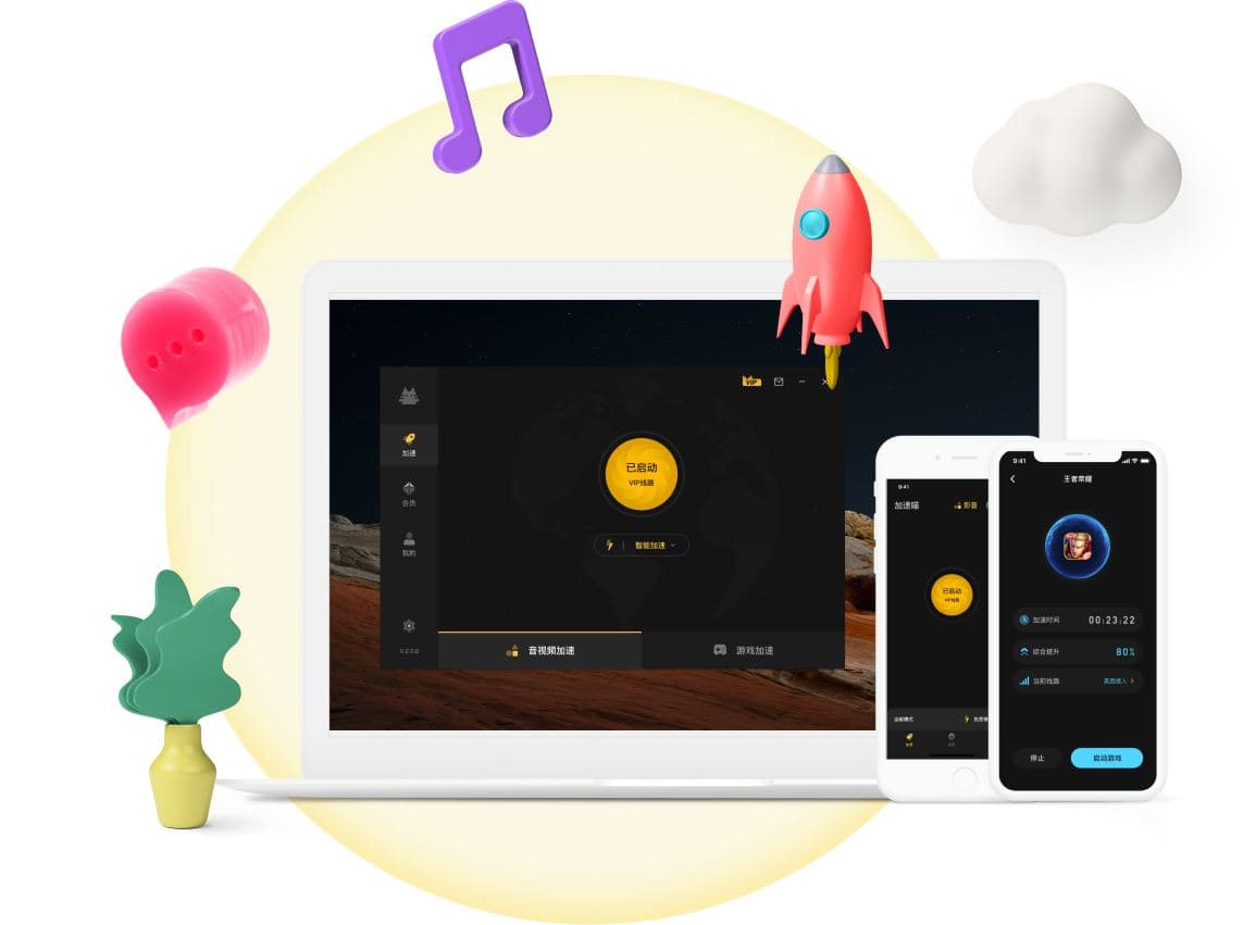 加速喵可同时加速回国音视频,满足您各种回国场景,玩游戏的同时还能支持YY语音、听音乐或者是直播等。加速喵游戏加速模式支持Windows、Android、iOS多平台同时使用,最多支持3台设备,随时随地畅享游戏加速。