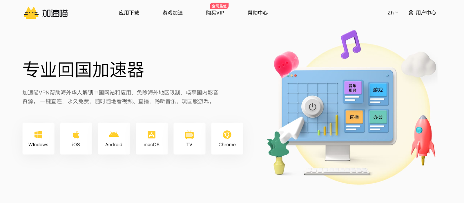 加速喵是一款专为海外华人及港澳台地区用户使用的回国加速器。免费、没有广告、操作简单,智能辨认回国流量。